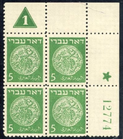 Israel 2 F – VF NH Plate Block #1 Group 25 # 12774 bale cv 1100.00
