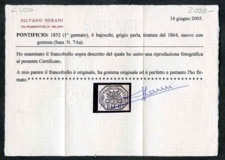 Roman States 7a (Sa 7Aa) XF LH Mint Pristine, 2005 Sorani Cert cv $1,650
