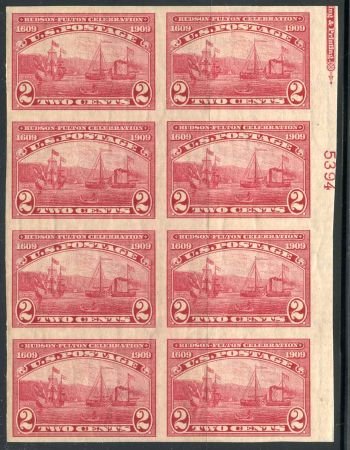 US 373 Early Commemoratives LH and NH VF Mint Plate block of 8 – LH top and bottom stamps trimmed at right cv $280+