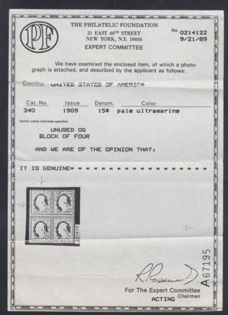 US 340 Washington / Franklin F – VF Pristine copy of PF Cert for block cv 150.00
