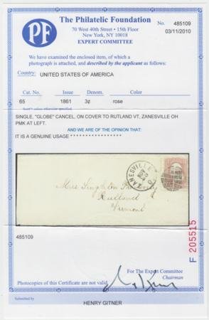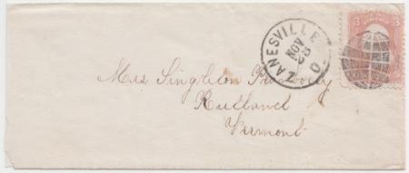 US 65 Early Classics Zanesville, OH Globe Fancy Cancel to Rutland, VT Superb Strike. PFC