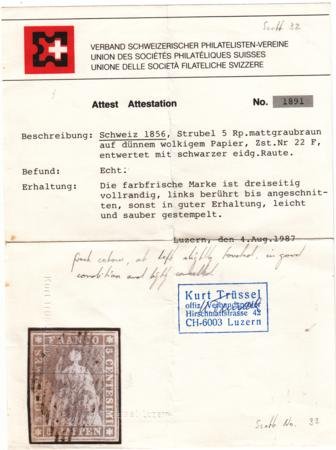 Switzerland 32 Used F – VF 4 Frame Lines 3 With Sound Margins, Swiss Cert (cv $1,100.00)