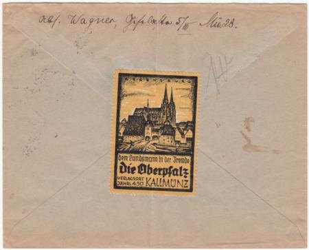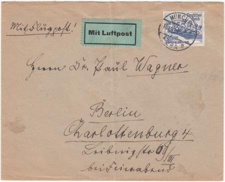 Germany 1935 (Dec 10) European sized Gray Airmail cover from Munich with B88 single franking. Large yellow and black vignette on reverse for Kallmunz. . Vertical crease down center of cover.