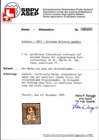 Switzerland 50a (36a) NH VF Pristine Color + Gum, Renggli Cert (cv: $3250 Sfr. $4000)