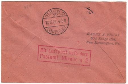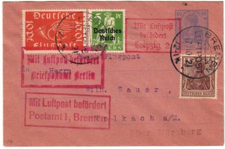 Germany 1921 (Oct 17) Early Airmail on Small Sized Colored 60pf Postal Cover from Bremen with added franking.
