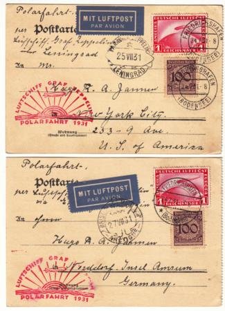 Germany 1931 Matched Set of 2 Zeppelin Polar Flight Cards, Malyguin / Leningrad with 328 and C35. Very unusual without the special flight stamp!