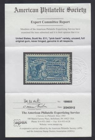 US E11 Special Delivery VF – XF NH Dark Ultramarine – Pink Back APS Cert. cv $450