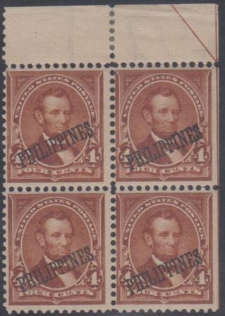 US Possessions – Philippines 220 F – VF Mint UR Block of 4; 2 NH, 2 Hinged with SE Weak Perfs cv 230.00