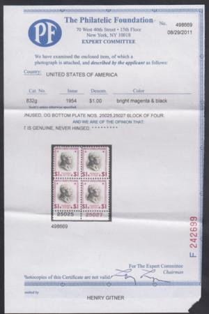 US 832g F NH Single – Copy of PF Cert for Plate Block
