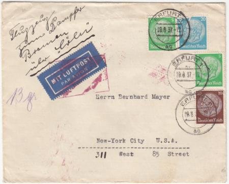 Germany 1937 Bremen Cover with Connecting Flight Cachet on Reverse