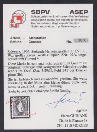 Switzerland 111 (92a) Fine Hinged Small thin, Guinand Cert. cv $250