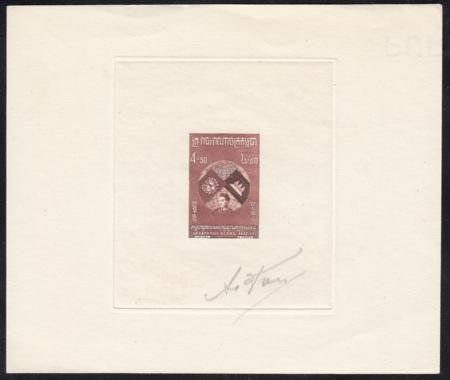 Cambodia 1957 Artist Die Proof in brown, Scott 60, 4.5fr Prince Sihanouk, flags.