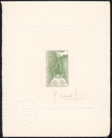 Cameroun 1965 Artist Die Proof in green, 415 9fr Coins in Cameroun Map.