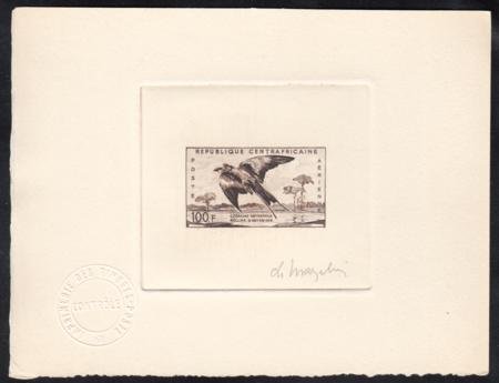 Central Africa 1960 Artist Die Proof : Scott C1 100fr Signed proof in sepia, Bird, Abyssinian Roller
