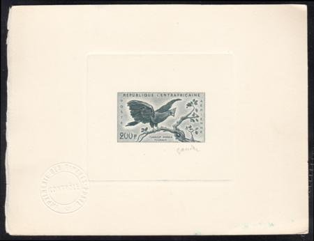Central Africa 1960 Artist Die Proof : Scott C2, 200fr Signed proof in light greenish blue, Bird, Gold Coast Touraco.