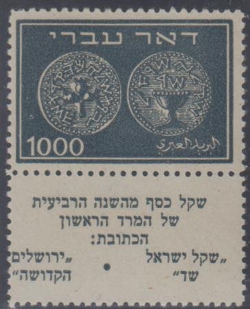 Israel 9 F – VF Mint NH Short Tab, Missing Bottom Salvage (cv $4,150 for Full Tab)
