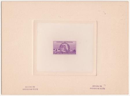 US 927P1 3c Florida Statehood Large Die Proof on Wove Paper. Bureau markings on front and back. Probably unique in private hands! cv$1500