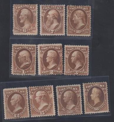 US O72-82 Officials Mint Treasury Set – No gum on Part OG are F+ except 2c+3c. 90c VF+. 2c, 6c, 7c OG cv $1,480