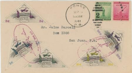 US / Puerto Rico 1941 (Sep 9) US 899-900 + Aerovias Puerto Rico 1c-50c Semi-Officials triangle airmails on local cover Ponce to San Juan. Airmails tied by Air Co. violet oval hand stamp. Rare!