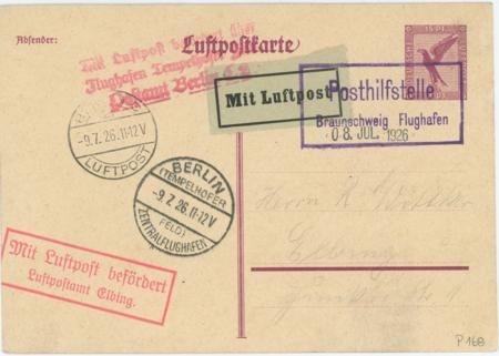 Germany 1926 (Jul 8) Braunschweig Flugafen boxed cancel Flight to Berlin. Not listed as first flight. VF air postal card #p168.
