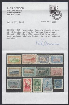 • Turkey 552 - 564, J87 1919 Armistice Set - Rendon Cert cv $657