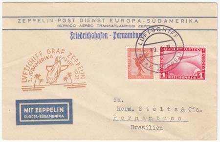 Germany 1932 (Apr 19) 3rd South American Flight on XF official Zeppelin Co. printed envelope. C35 + additional airmail are tied by On Board Cancel. S.150Ab + C35 €200