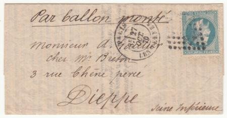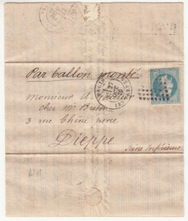 France Ballon Monte Le “Colonel Charras” VF, complete folded letter, Oct 27, 1870 Paris cancel, sent to Dieppe (Nov 2, 1870 backstamp), carried 460 kg of mail, heaviest load of correspondence carried on any siege balloon. (BM21 €435 )