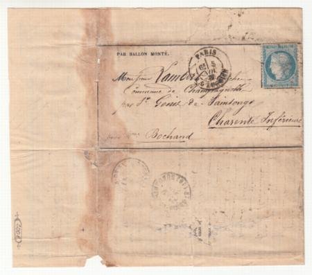 France Ballon Monte:Le “Gironde” Gazette des absents #5, Nov 5, 1870 Paris cancel, sent to Charente inferieure (Nov 9, 1870 backstamp), carried 60 kg of mail. Tape repair of separation at left edge. (BM27 €500