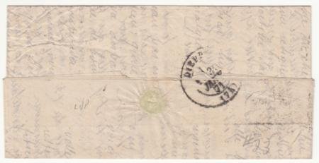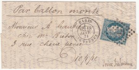 France Ballon Monte:Le “General Bourbaki” VF complete folded letter, Jan 18, 1871 Paris cancel, sent to Dieppe (Jan 30, 1871 backstamp), carried 125 kg of mail. The landing of this balloon escaped detection by local Prussian units. The basket and contents were transported successfully but the rest of the balloon was buried by the locals eliminating any evidence it had ever landed. (BM63 €500)