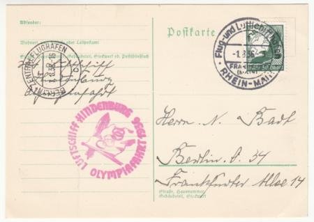 Germany 1936 (Aug 1) Hindenburg Olympic Flight on Postal Card. All postal markings on address side.