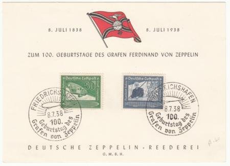 Germany 1938 (Jul 8 ) Official Card with C59-C60 For 100 Birth of Ferdinand von Zeppelin with special commemorative cancels.