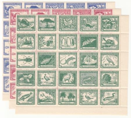 Chile 1948 Scott 254a, 255a & C124a Fauna & Flora, NH Blocks of 25: Penguin, Bird, Butterfly
