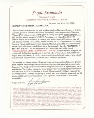 Germany 1926 (Jan 11) Oversized Hamburg – Bogota SCADTA Commercial Cover. Registered cover is 6 1/2″ x 9 1/2 ” with 327, 335, CLA 27 pair, CLA29 and CFLA2. Properly backstamped and sold with Sismondo certificate