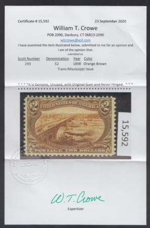 US 293 Early Commemoratives F – VF Mint NH Wm. Crowe Cert – Fresh! cv $5,750