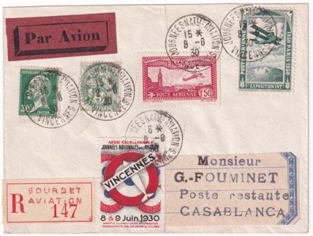 France 1930 (Aug 8) Inter Air Post Exhibition Cover to Casablanca. Registered cover has special cancel and backstamp for Exhibition. Tiny tear at top edge.