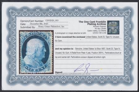 • US 23 Early Classics Ave - F Mint Short Perfs - Unused, No Gum, Type IV, Position 35R1L New Cert, cv $4,250