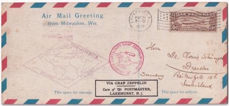 US 1930 (May 31) C14 F-VF on Legal Sized PPC of Milwaukee View by Northwest Airlines. Sent Lakehurst to Friedrichshafen with small boxed printed cachet. Some minor toning. Beautiful card!