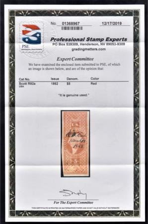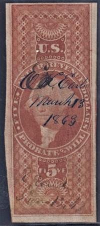 US R92a Revenue F – VF Used $5 Probate of Will PSE Cert cv $750