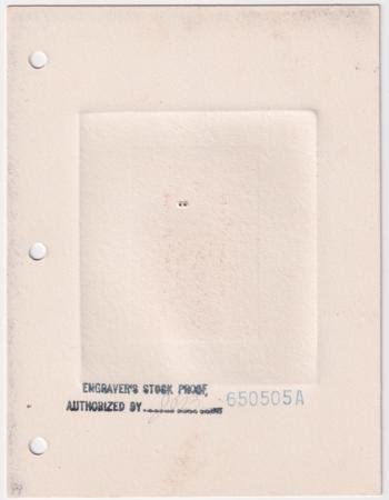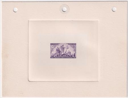 1940 #898P1 3ยข Coronado Expedition, VF large die proof in purple on India paper, die sunk on wove 178 x 136 mm, with filing punch holes at top. Bureau handstamp on the reverse reads “Engraver’s Stock Proof/Autohrized by” and initialled.With control number in blue. cv $1,500. Most probably the only known large die of this issue.