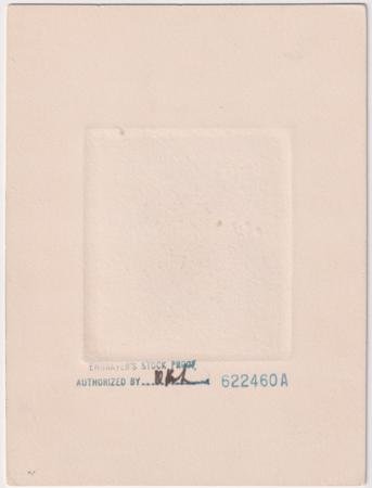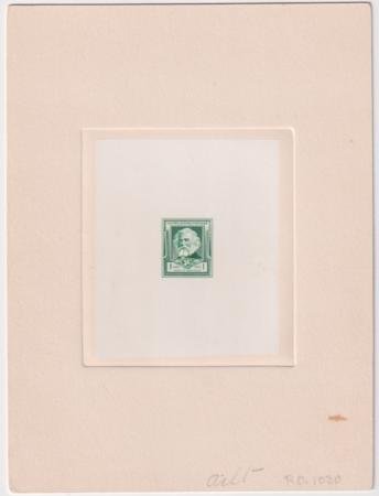 1940 864P1 1ยข Longfellow, VF die proof in green on India, die sunk on card , a stunner with immense color and incredible detail, all on immaculate India in oversized sink on 153 x 203 mm cream card; “P.O. 1030” penciled at lower right; reverse with control number 622460A and “Engraver’s Stock Proof/Authorized by” handstamps in blue; one toned spot at lower right of card. cv $1,500