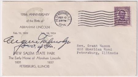US 1934 (Feb 12) 555 on Autographed Cover. Eugene Talmadge, Governor of Georgia 1933-37, 1941-43 signature on 125th Anniversary of Abraham Lincoln cover. (2/12/34)