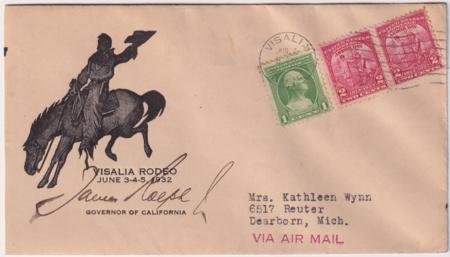 US 1932 (Jun 5) 715 + 705 on Autographed Cover, James Rolph, Governor of CA. Visalia Rodeo cachet on cover sent airmail.