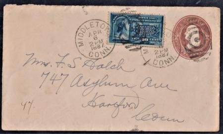 US E1 1887 (April 6) on U288 (Type U68) Entire Scarce Combination – Middletown, CT to Hartford, CT – F – VF Clean, Fresh Cover cv $375