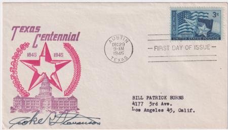 US 1945 (Dec 29) 938 Autographed FDC Signed by Governor of Texas, Coke R. Stevenson