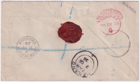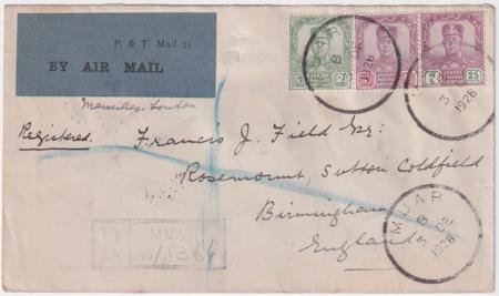 Malaysia: Penang, 1928 (Dec. 7), Penang – Amsterdam Flight, registered cover posted in Muar Dec. 3, 1928, and addressed to Birmingham, England; blue crossed Registry marking and Muar registered handstamp with “P. & T. Mail 25/By Air Mail” label and manuscript “Marseilles-London” on front; reverse reveals indistinct Joh[…?] 4 DE c.d.s., Penang 7 DE 28 double-circle c.d.s., red “registered/London, E.C/30 DE 28/4” receiver and Sutton Coldfield/31 DE/28/Birmingham receiver – along with a wax seal, Very Fine, Boesman Postvluchten #22s.