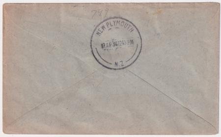Australia 1934 (Apr) First Official Air Mail Australia – New Zealand, backstamped Plymouth, addressed to Palmerston North, New Zealand.