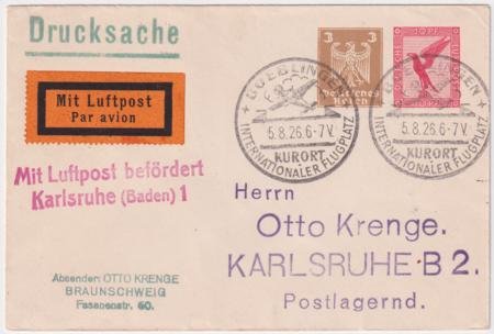 Germany 1926 (Aug 5) Boeblingeer – Karlsruhe Airmail Cover on 3pf + 10pf postal cover.