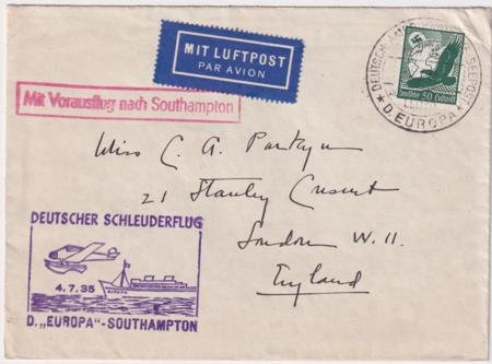 Germany 1935 Catapult Cover Europa – Southampton
