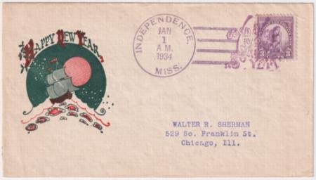 US Independence, Mississippi 1934 (Jan 1) New Year’s Day cacheted cover with 718 and a single strike of “Good Luck For The New Year” fancy cancel 581 in purple. Sent to Chicago, Il.