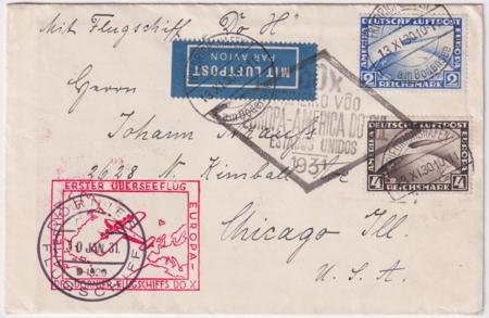 Germany 1930-1931 Do-X Flight Cover with C36 & C37. Stamps tied by Nov 13, 1930 cancels. Red rectangle flight cachet tied by on board cancel Jan 30, 1931. Nice long letter enclosed that mentions he is sending it by Do-X but probably never expecting it to take so long! Slight scratch on C36.
